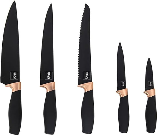 6 Pcs Kitchen Knife Set with Acrylic Block - Super-Sharp Steel Knives with Non-Stick Coating - Chef, Bread, Carving, Utility, Paring Knives - Stylish Cooking Tools with Black, Rose Gold Handle